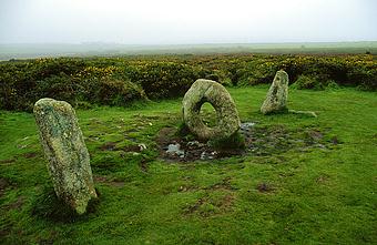 The Mên-an-Tol monument consists of four stones: one fallen, two uprights and between these a circular one, 1.3m (4ft 6in) in diameter, pierced by a hole that occupies about half its size. An old plan of Mên-an-Tol shows that originally the three main stones stood in a triangle, which makes certain astroarchaeological claims for it difficult to support. They could be the remains of a Neolithic tomb, because holed stones have been found acting as entrances into burial chambers. Its age in uncertain but it is usually assigned to the Bronze Age, between 3000-4000 years ago. Holed stones are found in many parts of British Isles as well as in other countries of the world and together with holy wells they have retained the ideas and customs associated with them more tenaciously than any other type of ancient sites. Beliefs connected with them are remarkably similar from the Orkneys to the far west of Cornwall. Traditional rituals at Mên-an-Tol (centuries ago known also as Devil's Eye) involved passing naked children three times through the holed stone and then drawing them along the grass three times in an easterly direction. This was thought to cure scrofula (a form of tuberculosis) and rickets. Adults seeking relief from rheumatism, spine troubles or ague were advised to crawl through the hole nine times against the sun. The holed stone also had prophetic qualities and, according to nineteenth-century folklorist Robert Hunt: If two brass pins are carefully laid across each other on the top edge of the stone, any question put to the rock will be answered by the pins acquiring, through some unknown agency, a peculiar motion.